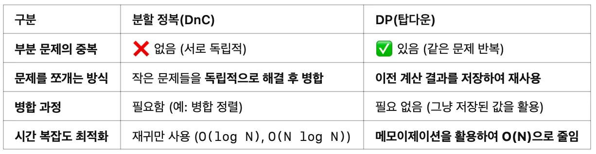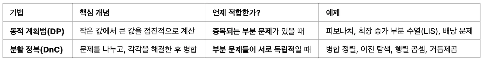 DP๋ ๋ถ๋ถ ๋ฌธ์ ๊ฐ ์ค๋ณต๋์ด์ ๊ฐ์ ์ฐ์ฐ์ ๋ฐ๋ณต์ ์ผ๋ก ํด์ผํ๋ ๊ฒฝ์ฐ์ ๋ ์ ํฉํ๊ณ DnC๋ ๋ถ๋ถ ๋ฌธ์ ๊ฐ ๋ ๋ฆฝ์ ์ผ ๋ ๋ ์ ํฉํ๋ค๊ณ ํจ